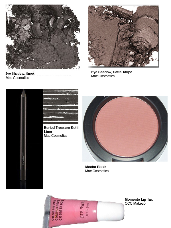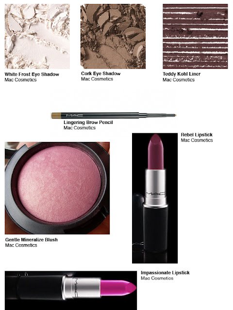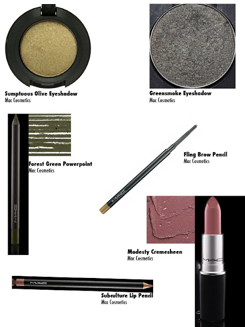 I decided to use Sumptuous Olive and Greensmoke eyeshadows because they are green. Green is the complementary color to red which is a natural blonde's skin undertone. This combo will intensify the color or undertone of a blonde's skin. Modesty lipstick is a warmer beige color which will balance out the coolness in the green eyeshadows. Use Sumptuous Olive on the Lid and Greensmoke in the crease.