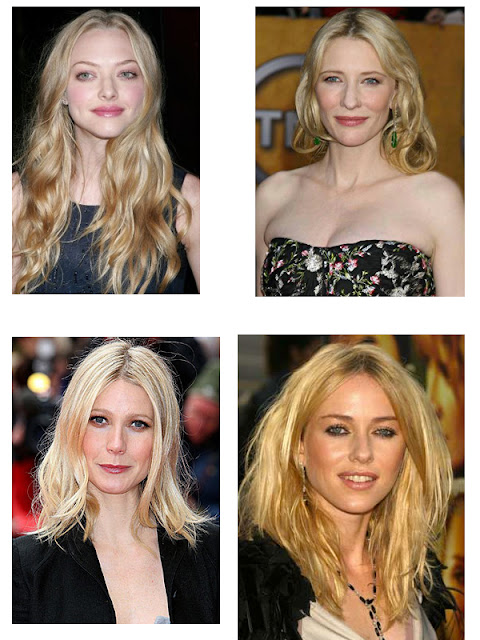 I digress I am not here to lambaste Beyonce's new look, I am here to teach you how to perk up your make up kit. Natural blondes such as actresses Amanda Seyfried, Cate Blanchette, Gwyneth Paltrow, and Naomi Watts know how to vamp up their hair color. Remember, for all intents and purposes blonde basically means 'yellow.' Since, most blondes are born with warm undertones one would venture to say that they should use cool colors in their makeup, yes? Wrong, because of the coolness of their hair color they must mix the colors on their face. No blonde should use just a cool or warm palette on their face but use a mixture of warm and cool colors to avoid looking dull. Yes, blonde hair looks fantastic on tanned skin, because when a person with warm undertones tans, their skin turns a burnished red/bronze color. So it still works. But I am not advocating tanning. I personally advocate natural skin and natural tans from walking or exercising in the sun, not laying out like a roasted chicken or under very dangerous UV Lights. Or, just use Bronzer...:D