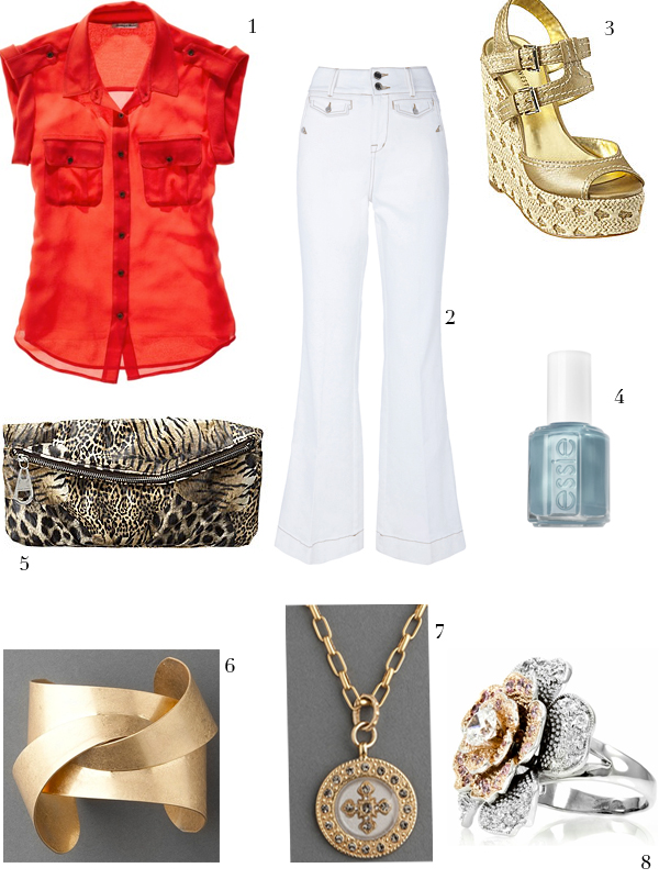 White jeans are alla moda this spring so if you do not have a pair you might want to invest in one. I love white jeans they are very springy to me and they can be dressy or casual. And no white does not make you look bigger if you wear it correctly or choose the correct silhouette. And Bell bottom boot cut looks good on everyone. And of course a spring/summer staple--espadrilles. Every girl should have a pair, the blue nail polish is a must have spring AND bonus it is the complementary color of orange (red/orange):
