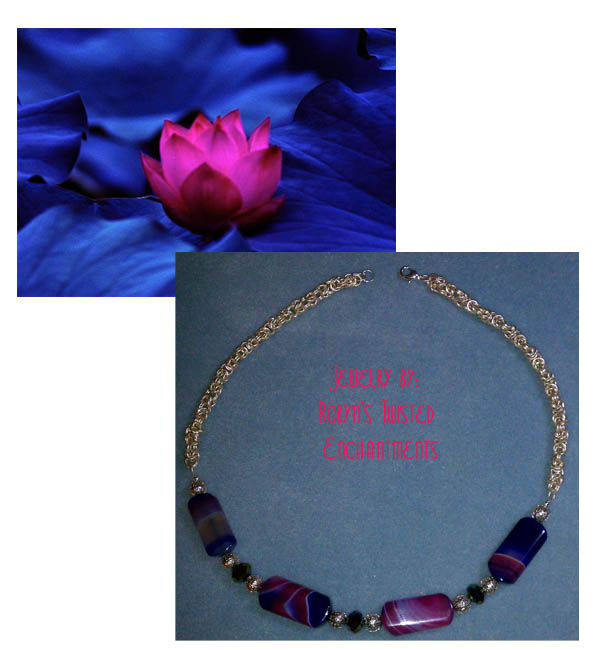 Robyn Clark over at Robyn's Twisted Enchantments is a budding jewelry designer in Houston that designs and makes custom made jewelry. She created this necklace for me based on this beautiful picture I sent her. The chain is hand crafted sterling silver and I was amazed at how she found the colors from this pictures. She is an amazingly creative person and her creations won't break your pocket book.