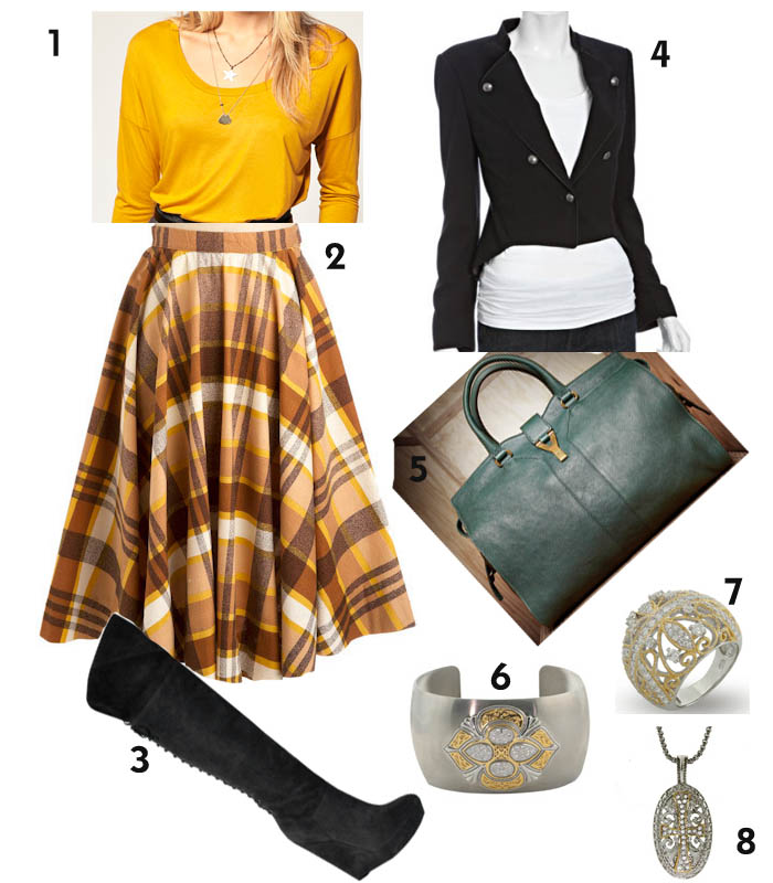 Who doesn't like plaid? I have been in love with plaid since fourth grade. I personally think I was either a naughty catholic school girl or Scottish aristocracy in a past life because I am obsessed with plaid and bright colored plaid at that? **SOLD** Just saying. Along with this military/calvary inspired jacket, cut so crisp that it would make any girl look lik she has a teeny tinny waist? Um, a girl can only resist so much temptation. **Swoons** Of course over the knee boots are a classic, but who says classics can't be an obsession? Throw in a pop of color and Renaissance styled jewelry and you've got yourself a fabulous outfit.