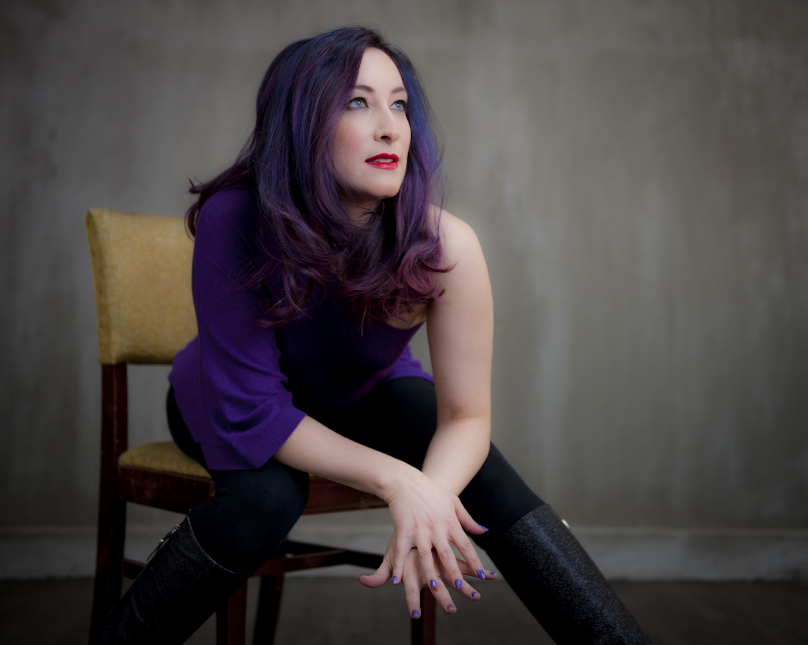 Once I'm at a venue and preparing for my live shows, I either start completely fresh, or if I'm in more of a rush, just add more makeup, keeping in mind that bright lights on stage tend to wash you out. I always wear mascara on stage, and I usually wear a sparkly green, dark blue or purple shade of eyeshadow at the bottom and in the crease of my lid, depending upon my outfit; favorite eyeshadows I happen to have in my makeup bag these days are Cover Girl, Sephora and Mattése. I also really like to add a sparkly silver eyeshadow as a highlighter below my brow, and even a little of it in the inner corners of my eye. For my lips, I add glitter in a complimentary shade (purple, gold and pink are most common), on top of my existing red lipstick. Those three added elements - mascara, eyeshadow and glitter - really help me go from "casual daytime" to "stage-glam" very quickly and easily! I've often had to make this transition in a moving vehicle, which can be a challenge, but it definitely impresses my band-mates when I emerge from the van, transformed!