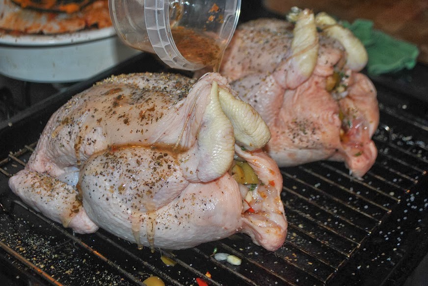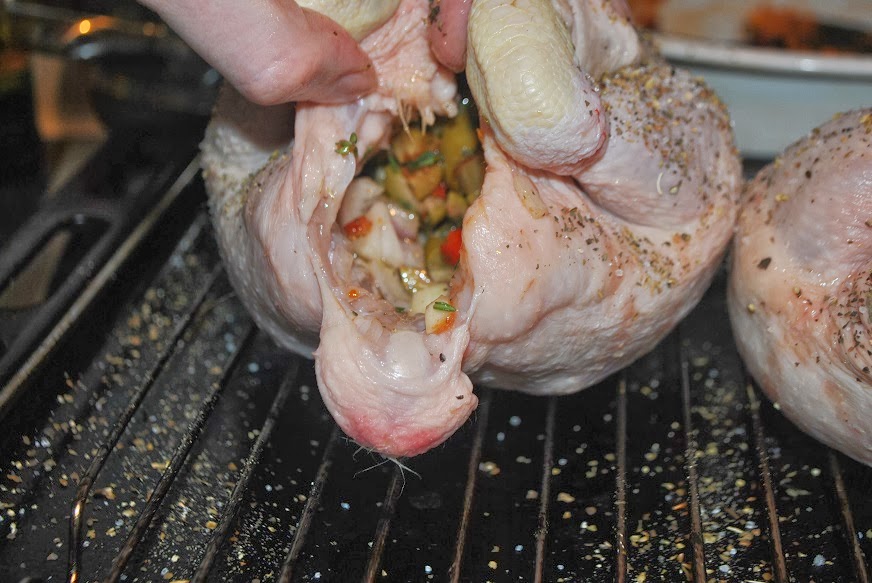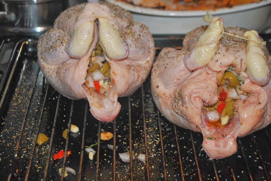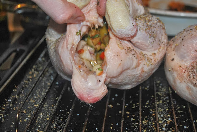 Then, massage olive oil on the surface of the chickens with your hands to loosen them up. Next, you must seduce the two ladies in waiting with promises of delicious yumminess to get them to open their legs so that you can stuff them with the mixture that you just made.