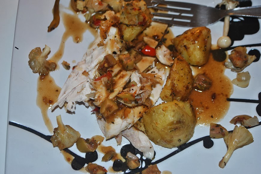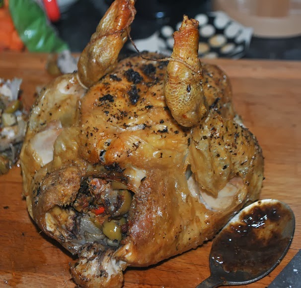 Once properly stuffed, sprinkle the top with coarse black pepper, sea salt, dried basil and oregano and drizzle the spicy olive oil from the olives on top. Pop them in the oven following the directions on the package of chicken. For these, we cooked them at 150C for 90 minutes until golden brown.
