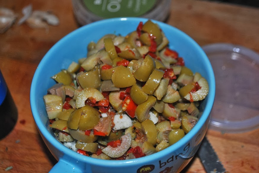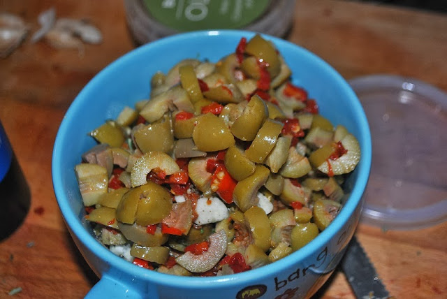 First, we chopped up 6 shallots, 4 garlic cloves, a handful of red chili peppers, and a cup of green olives (stored in spicy olive oil) with the pimentos in them. You can also use black Kalimata olives as well (which is typical Sicilian).