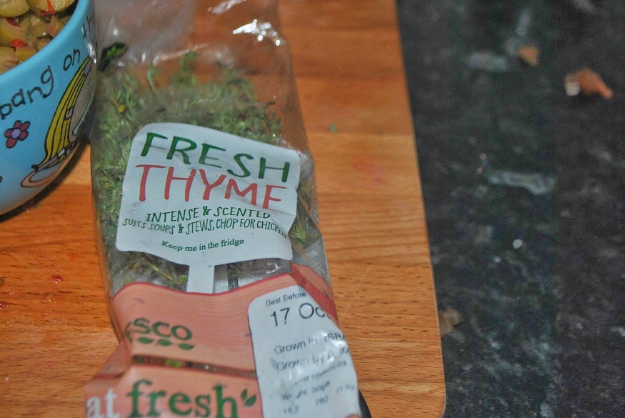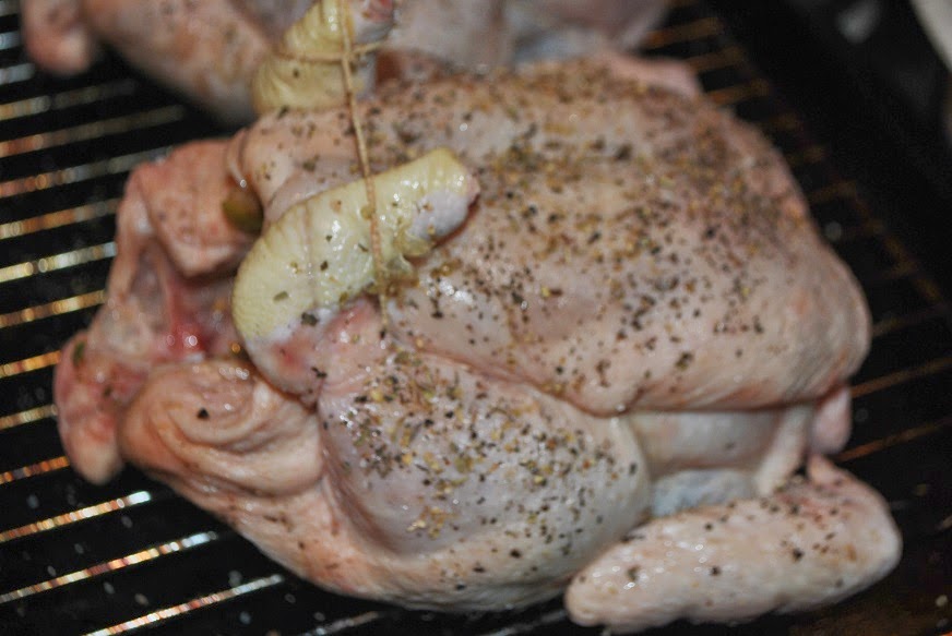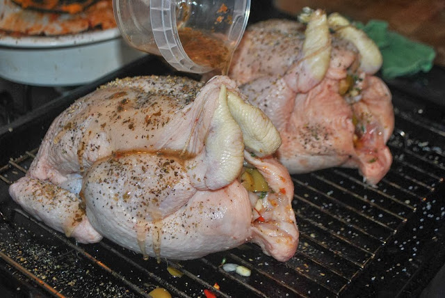 Add 1/4 cup olive oil, 1 tsp of sea salt, black pepper, basil, and oregano to the mix. Then 8 sprigs of thyme. Take note that these proportions are for two chickens not one.
